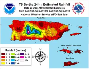 - ↑ "Tropical Storm Bertha Rains Upon Puerto Rico". San Juan, Puerto Rico: Wall Street Journal. Associated Press. August 2, 2014. Retrieved August 15, 2014.