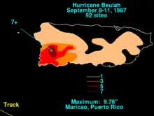 A slow-moving system, the depression steadily organized as it approached the Lesser Antilles. Observations from aircraft reconnaissance indicated that the system attained gale-force winds by 12:00 UTC on September 7, resulting in its upgrade to a tropical storm. It was also assigned the name Beulah, making it the second named storm of the 1967 season. Shortly after being named, Beulah clipped the southern coast of Martinique and entered the eastern Caribbean. Feeding off the warm waters of the Caribbean, the cyclone quickly strengthened and reached Category 1 hurricane intensity by 18:00 UTC on September 8. Rapid deepening ensued thereafter, with the storm's central pressure falling to 940 mbar (hPa; 27.76 inHg) the following day, as it passed 100 mi (160 km) south of Puerto Rico.[3] At this time, 1-minute sustained winds were estimated to be at least 140 mph (230 km/h), ranking Beulah as a Category 4 hurricane on the Saffir–Simpson hurricane scale (SSHS).[2] Upon reaching this strength, weather radar imagery from San Juan, Puerto Rico showed that Beulah featured a 15 mi (24 km) wide eye, surrounded by an intense eyewall about 8 mi (13 km) thick.[4]