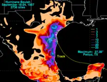 Regarded as the third-largest hurricane on record at the time,[6] Beulah moved along a slowing, erratic, and somewhat cycloidal path. Slight weakening ensued as it neared land and Beulah ultimately made its final landfall south of Brownsville, Texas, near the mouth of the Rio Grande around 13:00 UTC on September 20. No direct measurements exist at the core of the hurricane as it moved ashore; however, based on a minimum pressure of 951 mbar (hPa; 28.08 inHg) in Brownsville, the hurricane likely struck land with a central pressure below that value.[3] A vessel anchored in the Port of Brownsville measured peak wind gusts of 136 mph (219 km/h), equivalent to a low-end Category 4 hurricane.[5][6] According to the National Hurricane Center, Beulah struck as a Category 3 hurricane, and was originally thought to have had a central pressure of 950 mbar (hPa; 28.05 inHg) at landfall,[7] but a 2020 re-evaluation as part of the Atlantic hurricane reanalysis project lowered this to 940 mbar (27.76 inHg).[8] Once over land, the hurricane slowly weakened as it remained relatively close to the coast. Sustained winds dropped below hurricane-force on September 21, roughly 24 hours after landfall. The system subsequently stalled near Alice, Texas, before turning to the southwest.[3] It was initially thought that, after diminishing to a tropical depression late on September 22,[2] Beulah's circulation finally dissipated over the mountainous terrain of Nuevo León, Mexico;[3] however, the 2020 reanalysis concluded that Beulah survived through at least September 24, when it reemerged into the Gulf of Mexico, crossing the Mexican coast between the cities of Tampico and Tuxpan.[8] Due to a lack of suitable observations, it is unknown how much longer after this Beulah continued to exist as a tropical depression over the southern Gulf of Mexico before degenerating into an open trough.[8]