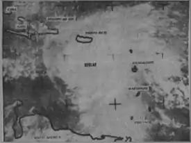 During the evening of September 9, Beulah turned westward as weak ridge developed over the Bahamas, between it and the newly formed Tropical Storm Doria.[3] The powerful storm weakened somewhat as an eyewall replacement cycle began to take shape. During this phase, the inner-eye of Beulah contracted to roughly 3–4 mi (4.8–6.4 km) in diameter while a second eyewall spanned an area 28 mi (45 km) across. The smaller eye soon dissipated, and the larger one became the single, dominant feature by the morning of September 10. The completion of this process marked the first time that an eyewall replacement cycle was observed in its entirety.[4] The aforementioned westward turn placed the Dominican Republic in the line of danger, an area still reeling from the devastating effects of Hurricane Inez just one year prior. However, the storm unexpectedly collapsed as it approached the Barahona Peninsula and struck the area as a greatly weakened, though still significant, Category 1 hurricane, with estimated winds of 90 mph (140 km/h) around 18:00 UTC on September 11.[3][2]