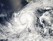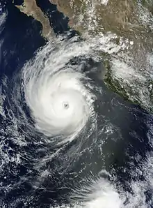 The upper-level environment became even more favorable during the overnight of June 1–2 as anticyclonic outflow developed above Blanca, providing necessary ventilation for intensification.[5] Turning south along an erratic, drifting course,[1] an eye feature developed within the storm's convective mass on June 2.[6] Blanca reached hurricane strength by 18:00 UTC and underwent rapid intensification thereafter.[1] A small, pinhole eye soon appeared on visible and infrared satellite imagery.[7] Reaching major hurricane intensity by 12:00 UTC on June 3, Blanca marked the earliest occurrence of a season's second such storm on record.[1] The system featured a small, well-defined eye surrounded by intense convection.[8] Hours later, at 18:00 UTC, the hurricane achieved its estimated peak strength as a Category 4 on the Saffir–Simpson hurricane wind scale with maximum sustained winds of 145 mph (230 km/h) and a barometric pressure of 936 mbar (hPa; 27.64 inHg).[1] Given continued favorable conditions, forecasters at the NHC predicted Blanca to achieve Category 5 status—the highest ranking on the scale, indicating winds in excess of 156 mph (251 km/h).[9]