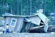 With its location close to the storm's center, Dauphin Island saw the greatest damage in Alabama. Access to the island was shut down during and immediately after the hurricane, slowing the progression of damage assessments.[88] Additionally, the storm cut power and phone services.[89] Post-storm surveys revealed discernible patterns in structural damage on the island; these included a nearly complete lack of destruction on the heavily wooded eastern end, and damage concentrated closer to the western side and along areas exposed to strong easterly winds.[90] First-hand accounts relayed that in the most severe cases, entire elevated homes were torn from their pilings and swept into the Gulf of Mexico.[91] The number of homes demolished in that manner was informally placed at 50,[92] though such total building collapses were typically confined to poorly secured buildings.[90] In total, the hurricane destroyed 190 residences on Dauphin Island, accounting for nearly 25% of all homes, and a further 235 sustained substantial damage.[92] An unofficial and early estimate of losses on the island was $30 million.[86]