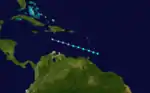 The first storm of the season, already at tropical storm intensity, was identified on September 6 to the east of Grenada.[2] A small storm, it quickly passed through the southern Lesser Antilles early on September 7.[3] The next day, the storm weakened to a tropical depression before dissipating as a shallow but large system.[2][3] A schooner sailing from Bridgetown to Suriname encountered heavy seas just a day out of port and turned back. It was thrown onto the pierhead and wrecked. The captain and a crewman were swept overboard and drowned.[3]
