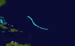 On October 1, a tropical depression developed in the southwestern Caribbean Sea. Moving slowly north-northeastward, it reached tropical storm status early on October 3. The following day, the storm curved northeastward.[2] Kingston, Jamaica, recorded rainfall as the system bypassed the island.[4] Late on October 5 and early on October 6, the storm passed through the Windward Passage.[2] Eastern Cuba was affected "with some force", but damage was not significant.[4] Entering the Atlantic Ocean,[2] the system passed through the southeastern Bahamas and Turks and Caicos Islands without causing damage.[4] While centered about halfway between Bermuda and Turks and Caicos Islands, the storm strengthened into a Category 1 hurricane on the Saffir–Simpson hurricane wind scale.[2]