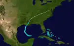 A tropical storm was first observed in the Gulf of Mexico on October 5, while located about 105 miles (170 km) north of the Yucatán Peninsula. The storm strengthened slowly while crossing the Gulf of Mexico and peaked with sustained winds of 50 mph (85 km/h) early on October 8. At 1700 UTC on the following day, it made landfall near Morgan City, Louisiana, at the same intensity. The system quickly weakened inland and transitioned into an extratropical cyclone over Mississippi on October 10. The extratropical remnants dissipated over Virginia on October 11.[2] The remnants of this storm brought heavy rains to the Eastern United States and Atlantic Canada.[3]