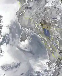 Late on August 11, Hurricane Ismael began to weaken as it encountered cooler waters.[1] According to the EPHC, the storm was downgraded to a Category 1 on the SSHWS late on August 11. The following day, Ismael was downgraded into a tropical storm about 380 mi (610 km) west of the Baja California Peninsula.[3] On August 13, Hurricane Hunters flew through the storm, penetrating the center of circulation twice.[1] During its first penetration, the aircraft reported winds of 40 mph (65 km/h) just east of the center and also noted that the weakening system had a poorly defined eye. Two hours later, the aircraft made its second pass through Tropical Storm Ismael, with the aircraft reporting winds of 35 mph (55 km/h). Based on this, the storm was downgraded into a tropical depression while centered about 250 mi (400 km) west of Point Ensenada. After turning north and entering even cooler waters,[1] the storm made landfall on Guadalupe. The depression dissipated later on August 14 about 20 mi (30 km) southwest of Guadalupe Island[3] which is not normally affected by tropical cyclones.[4]
