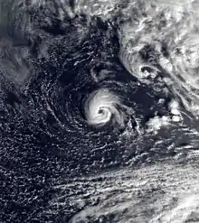 After being classified as a hurricane, Karl gradually strengthened, and its circulation became more distinguished from the surrounding cloudiness. A trough that emerged from North America steered the hurricane eastward,[1] and on November 26, it reached its peak intensity with maximum sustained winds of 85 mph (140 km/h) and a central barometric pressure reading of 985 mbar (hPa; 29.09 inHg). Karl maintained this strength for approximately 18 hours until beginning to weaken slightly as it accelerated towards the northeast.[3] On November 27, the storm's eye became more ragged as the cyclone passed within 230 miles (370 km) of the Azores and started to show signs of deterioration.[1][5] The trough over the North Atlantic developed into the dominant low pressure area, and Karl turned northward around its periphery. Karl became extratropical on November 28 and later merged with another approaching system within a day, and was declared dissipated by November 29.[1][3]