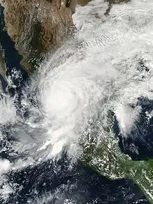 Roughly 8,800 of the 9,000 residents in the landfall location, San Blas, evacuated, which ultimately contributed to a low death toll.[1] Officials ordered for the evacuation of 50,000 residents and fishermen along the southwest coast of Mexico, including 3,000 in the Islas Marías,[7] 10,000 near Mazatlán, and 15,000 near flood-prone areas. Civil authorities closed all schools and docks in potentially affected areas. The Mexican Red Cross prepared for the storm by shipping 215 tonnes of relief supplies such as food, water, clothing, and medicine to the Red Cross branch in Jalisco. Assistance from the Yucatán Peninsula delivered 10 tonnes of food and water, as well.[8] The Mexican Red Cross prepared 20 emergency shelters in the state of Nayarit.[9] Officials took security measures in Los Cabos, Baja California Sur, where the Asia-Pacific Economic Cooperation was meeting during the passage of the hurricane. Early forecasts indicated a possible threat to the meeting, causing the government to prepare for a potential alternate site.[7] Officials recommended boats to stay at port due to severe conditions.[10]