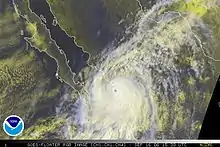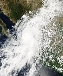 Hurricane Lane continued to organize with its 9-mile (14 km) wide eye, surrounded by very deep convection, and the storm strengthened further to reach peak winds of 125 mph (201 km/h) by midday on September 16.[13] It turned unexpectedly to the northeast, and at 1915 UTC on the September 16, Hurricane Lane made landfall in a sparsely populated region of Sinaloa, 20 miles (32 km) southeast of El Dorado.[14][15] This made Lane the most intense hurricane to strike Mexico since Hurricane Kenna in the 2002 season.[16] The combination of the mountainous terrain of Mexico and increasing west-southwesterly wind shear caused the storm to rapidly weaken,[17] and the storm dissipated on September 17.[18] The remnants of Lane later moved into Texas, United States.[19]