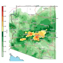 - 1 2 Seay, June (September 26, 2019). "Severe Weather Struck East Of Phoenix Bringing Rainfall Exceeding 5 Inches In Some Areas". The Arizona Tribune. Retrieved March 28, 2021.