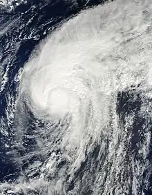 Over the course of October 8, Otto began to accelerate to the northeast under the increasing influence of a vertically deep trough off the US East Coast.[10][16] Conditions aloft remained conducive, and the storm's convection deepened symmetrically over the center to form a large, well-defined central dense overcast.[17][18] By 1200 UTC, Otto's winds had reached 75 mph (120 km/h) while a mid-level eyewall began to form, prompting the NHC to upgrade the storm to a Category 1 hurricane south of Bermuda.[18] Further strengthening ensued as the newly formed hurricane proceeded over the warm waters of the central Atlantic; microwave imagery revealed the eye, though obscured, was vertically well established, marking Otto's peak strength with estimated winds of 85 mph (140 km/h).[19]
