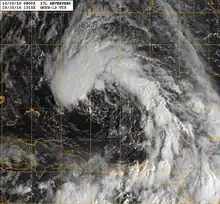 In late September, a large area of disturbed weather associated with two tropical waves formed just east of the Lesser Antilles.[2] The disturbance drifted very slowly west-northwestward,[3] inhibited by strong wind shear that eventually caused the westernmost wave to dissipate.[4] Albeit weak, an elongated remnant trough, or area of low pressure, persisted for several days, stalling over the extreme eastern Caribbean Sea as a nearby upper-level cyclonic vortex retrograded to its north.[4][5] By October 5, the trough had drifted northward into a more favorable atmospheric environment over the Virgin Islands, which allowed the lowest pressures to extend to the surface. The low became well defined, interacting with the adjacent upper vortex to produce a wide convective banda concentrated region in which strong showers and thunderstorms can formover the northeastern Caribbean.[6] Over the next day, the system continued to acquire a prominent subtropical structure,[7][8] developing a markedly larger wind radius than typically seen in pure tropical cyclones. Satellite observations also revealed that although the lower wind circulation was distinct, it had become intertwined with the cyclonic vortex aloft to its southwest, confirming the hybrid nature of the system.[9] The National Hurricane Center (NHC) thus classified the system as a subtropical depression at 06:00 UTC on October 6, when it was 265 mi (425 km) north-northwest of San Juan, Puerto Rico.[10]