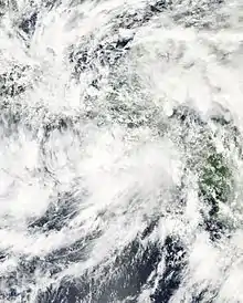 The precursor of Patricia was a large and sprawling system that affected much of Central America with heavy rain for several days.[1][23] Rainfall was enhanced by the presence of multiple systems, including a tropical wave and a second disturbance over the Caribbean Sea.[1] One person was killed in the Alta Verapaz Department and approximately 2,100 people required evacuation across Guatemala.[23][24] A total of 442 homes and 28,200 ha (70,000 acres) of crops were damaged while roughly 223,000 people were affected by flooding.[25][26] Government officials deployed emergency teams and Q40 million (US$5.22 million) was available for relief operations.[25] In nearby El Salvador between 6.3 and 7.3 in (160 and 185 mm) of rain fell, causing similar floods.[27] Dozens of homes were affected and four people were killed.[27][28] The Goascorán River overflowed its banks twice in two days, inundating surrounding communities.[27] Owing to widespread flooding, authorities suspended school activities across the country on October 19.[28] In Nicaragua, a landslide buried four miners in Bonanza; one died while the others were rescued.[29] The Ulúa River in Honduras over-topped its banks for the first time in 17 years on October 18, prompting the evacuation of more than 200 people.[30][31] Furthermore, flooding damaged 10 homes in Jacó, Costa Rica.[32]