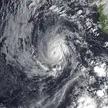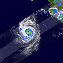 Located in an area of warm water temperatures and light wind shear, Hurricane Paul continued to intensify and organize;[11] its well-defined eye was surrounded by a ring of deep convection while outflow remained strong to the north and south.[12] On October 23, while located 465 miles (748 km) south-southwest of Cabo San Lucas, Paul reached its peak intensity of 105 mph (169 km/h), a Category 2 hurricane on the Saffir-Simpson Scale.[1] A large trough located off the west coast of California turned the hurricane to the north-northwest,[13] and later to the north. The combination of increasing shear and dry air quickly weakened Paul[14] to a tropical storm on October 24 as its low-level circulation became detached from the diminishing convection.[15] The storm then turned to the northeast after passing near Socorro Island.[16] Despite increasing wind shear of over 50 mph (80 km/h), Paul remained a tropical storm while its circulation remained on the southwest side of its developing deep convection. Early on October 25, the storm passed about 100 miles (160 km) south of the southern tip of Baja California.[17] The circulation briefly became involved with the deep convection as it accelerated northeastward, though as it approached the coast of Sinaloa, the center again decoupled from the upper-level circulation.[18] Later that day, Paul weakened to a tropical depression a short distance off the coast of Mexico, and turned to the north.[19] Early the next day, the depression, devoid of any deep convection, made landfall near Isla Altamura in northwestern Sinaloa. Hours later, the National Hurricane Center issued the last advisory on the dissipating tropical depression.[1][20]