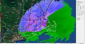 In parts of southern New England and upstate New York, the remnants of post-tropical cyclone Zeta brought accumulating snow to the region, after interacting with a cold front also moving through.[79] The highest amount of accumulation was 6.5 inches (17 cm) of snow recorded in Grafton, Massachusetts.[80] The National Weather Service at Norton, Massachusetts set a monthly record for snow, at 3.5 inches (8.9 centimetres).[81] This early-season snowstorm resulted in some downed tree branches in the region.[82] The snowstorm also caused slippery road surfaces, leading to numerous crashes, some serious, in the state of Massachusetts.[83] The cold front associated with Zeta dropped temperatures on the morning of October 31 to 19 °F (−7 °C) in Albany, New York, just one degree shy of the record. This is well below the typical low temperature of 35 °F (2 °C). Highs that day struggled to get into the 40s.[84] Parts of New Jersey saw temperatures get as low as 20 °F (−7 °C) after Zeta dropped snow in the northern portion of the state, acculumating to 2.4 inches (6.1 cm) in High Point State Park.[85][86]