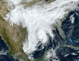 Dry air wrapped around the northern half of Zeta's circulation as it moved off shore over the southern Gulf of Mexico, leaving its center partially exposed,[8] though it began to re-intensify on October 28, in a conducive environment of low shear and warm Sea surface temperatures.[1] At 06:00 UTC on October 28, while located about 410 mi (660 km) south of New Orleans, Louisiana, Zeta became a hurricane again.[9] It then began to accelerate, turning towards the northeast because of an approaching upper-level low and associated cold front moving across the Southern Plains while ridging was located off the Southeast Atlantic U.S. Coast.[10] While within the swift flow between these systems, Zeta rapidly intensified as it moved quickly, with a forward speed of (25–30 mph (40–48 km/h), toward the Louisiana coast.[1] Despite marginal sea-surface temperatures and increasing wind shear, the storm's velocity kept it from weakening.[10] It continued to strengthen until it reached its peak intensity, as a category 3 hurricane, with sustained winds of 115 mph (185 km/h) and a minimum barometric pressure of 970 mbar (29 inHg), as it made landfall near Cocodrie, Louisiana, at 21:00 UTC.[1] Operationally, the National Hurricane Center determined the storm to only be a category 2 at landfall, but it was upgraded to a category 3 in post season analysis.[11] The storm began to gradually weaken as it moved directly over New Orleans and then into southern Mississippi.[1] Its maximum sustained winds decreased to tropical storm strength early on October 29, about 25 mi (40 km) south-southeast of Tuscaloosa, Alabama.[12] It then accelerated northeastward across northern Georgia and the southern Appalachian Mountains,[1] before transitioning into a post-tropical cyclone about 25 mi (40 km) south-southeast of Charlottesville, Virginia.[13] The system continued moving rapidly northeastward overnight on October 29–30, becoming entwined with a frontal zone[1] and bringing accumulating snow to parts of New England,[14] before dissipating east of the mid-Atlantic U.S. coast on October 30.[1] Several days later, the low-pressure system carrying Zeta's remnant energy brought heavy rain and strong winds to parts of the United Kingdom.[15]
