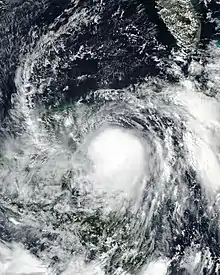At 00:00 UTC on October 15, the National Hurricane Center (NHC) began to monitor the southern Caribbean Sea for the possible development of a broad area of low pressure over the region.[3] A large area of unsettled weather developed over the southwestern Caribbean by October 19 due to the combination of a tropical wave and a trough of low pressure. Although unfavorable upper-level winds prevented further development of the tropical wave, southerly flow from that system caused Zeta's precursor trough to drift northward.[1] Three days later, satellite images and radar data showed that the system, located near Grand Cayman Island at the time, was gradually becoming better organized.[4] Following an increase of deep convection overnight into the morning of October 24, satellite data indicated that a well-defined low formed by 12:00 UTC October 24, marking the formation of Tropical Depression Twenty-Eight. Then, 12 hours later, the depression strengthened into Tropical Storm Zeta,[1] while located about 270 mi (430 km) east-southeast of Cozumel, Quintana Roo.[5] After remaining nearly stationary for over a day, the storm began to move northwestward, and, despite experiencing some north-northwestwardly wind shear,[6] Zeta steadily intensified, reaching hurricane strength by 06:00 UTC on October 26, while located about 230 mi (370 km) southeast of Cozumel. At 03:55 UTC the next day, the hurricane made its first landfall near Ciudad Chemuyil, Quintana Roo with sustained winds of 85 mph (135 km/h).[1] It weakened to a tropical storm over the Yucatán Peninsula, and moved offshore of the northern coast of the peninsula by 15:00 UTC, about 25 mi (40 km) north-northeast of Progreso, Yucatán.[7]