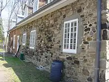 It is a 3-storey, gable-roof house built in rural French-style. For an urban home, it is larger than average for the period.[2] There are stone walls that are 60 cm (2 ft) thick. Around the windows are flat stones. This suggests a wealthy family as it was rare at the time. There are S-shaped holders and hinges designed to hold the shutters open. There is a flat stone that served as a kitchen sink. Wallpaper is from 1885. The first floor is supported by 3 trees, one of which still has bark. The attic is constructed with wooden posts and beams.[3] There are ventilation holes in the basement walls to allow the storage of vegetables during the winter and prevent them from rotting. These holes were once thought to be gun holes to defend against "marauding natives".[3]