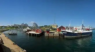![]() Husøya harbor with the Sanna mountains in the background. | |
