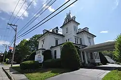 The Hutchins House is prominently situated in the village center of Waldoboro, on the north side of Main Street (Maine State Route 220) between the post office and the Broad Bay Congregational United Church. It is a 2+1⁄2-story wood-frame building, with a roughly rectangular footprint augmented by several projecting sections and a three-story tower. It is covered by a flared hip roof pierced by hipped dormers, and the tower is capped by a hipped roof with iron cresting at the peak. Eaves are decorated with Stick style brackets, and there is applied stick style woodwork on many exterior surfaces. Windows have shallow shed-roof hoods above them, and some have wooden panels below. Projecting bays have windows set in pointed-arch openings, again decorated with Stick style elements.[2]