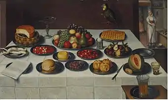- 1 2 3 Attribué a Huybrecht Beuckelaer, Mûres, cerises, poires, melon et autres fruits, panais, pain, fromages et une gauffre, roemer, tazza et salière sur une table drapée at Christie's (in French)