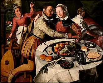 His Prodigal son feasting with harlots is not only a kitchen style scene but also falls in the category of the 'loose company' or 'merry company' painting genre developed earlier in the century by Jan Sanders van Hemessen. Beuckeleer depicts the subject in the form of a rendezvous between an elegantly dressed young couple sitting at a table. On the table a lavish still life is displayed, adding to the impression of upscale taste. The elegant man has clearly started his wooing earlier by playing the lute at his side. However, the actions of the servants makes clear that the true nature of the setting is that of a brothel rather than that of an upscale dwelling. Like Jan Sanders van Hemessen did in his earlier treatment of this subject, Beuckeleer included in his picture another scene from the biblical story of the prodigal son: in the background on the left the prodigal son is seen eating pig swill after he has squandered his inheritance and fallen on hard times.[14]