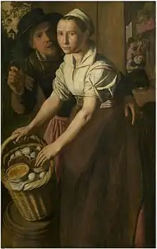 The market and kitchen scenes showing the lavish produce available in Antwerp at the time have often been interpreted as showcasing the prosperity of Antwerp, the then most important trading port in the Netherlands.[15] Others see the compositions as satirical and bearing a moralistic intention.[16] Some commentators have pointed to the erotic tension between the various actors in the scenes. For instance, the composition The kitchen maid and her helpers shows a cook standing in front of a fireplace, while she holds a big cabbage under her left arm and her right hand points to a chicken on a spit. A kitchen boy sitting at her feet on a bench with a dog on his lap is turning the spit. With his right hand he points to a young kitchen helper behind the kitchen maid. This young helper is placing a pot on a kitchen counter and is returning the boy's gaze. The kitchen interior is unmistakably dominated by erotic tension between the kitchen boy and the older kitchen maid. The big dog in the lap of the kitchen boy refers to his sexual desire while various comical and farcical foods, such as the rotisserie chicken, the cauldron of porridge, the cucumbers and the large cabbage under the arm of the kitchen maid indicate that she is available. In The egg seller another popular theme of Flemish genre art is depicted: that of the unequal love between an older man and a younger woman.[17]