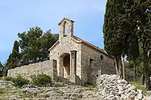 On the cape to the south of the town lies the Franciscan Monastery with a church of Our Lady of Mercy, built in the late 15th century.[5] Hanibal Lucić's grave is under the main altar in the church. The cloister, with its monumental rounded arches with a well in the middle, dominates the whole of the Renaissance monastery. The bell tower, in Renaissance style, is the work of an artist from Korčula.