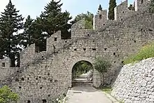 The town walls date from the 13th century and, with later additions and renovations, stretch from the fortress down to the square where they join the third wall in an east–west direction. This wall is practically camouflaged by a series of patrician houses built into it. The walls are interspersed with four-cornered side towers, the construction of which lasted, with essential repairs, from the 13th to the 16th century. The current fortress Fortica, also known as Tvrđava Španjola (Spanish Fort) was constructed following the gunpowder explosion in 1579 which devastated the old fortress.[4] Today, the fortress includes a modern tourist complex, and provides a superb view of the town and its surroundings. In 1811, during the rule of the Napoleonic Empire, a second fortress Trđava Napoleon was constructed on the higher hill to the northeast. The site now also houses an observatory.