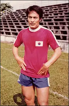 He was then included in the standing army roster for the 1974 Asian Games and the Asian Football Cup,[55] and returned to the national team after a good performance, including scoring the winning goal in an exhibition match.[56][57] He was in good form in the same year, assisting Cha Bum-kun's equalizer in an exhibition match against Middlesex Wanderers,[58] but was unable to get any further opportunities as he played a part in the team's defeat due to a poor performance in the third leg of the Asian Games group stage against Kuwait.[59] He was absent from the 23rd Japan-Korea Regular Tournament held shortly afterwards due to his participation in the Koyeon Exhibition.[60] He then participated in the 1973 King's Cup,[61] and was involved in the team's winning goal with a long throw-in in the semi-final against Malaysia and a long throw-in in the final against Thailand, helping the team win their second consecutive title.[62][63] For his performances for the national team and his affiliates, he won his second title at the 1974 KFA Awards.[64]
