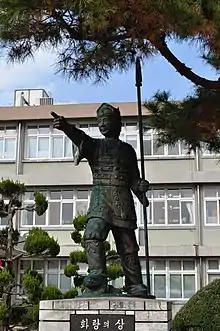 Hwarang, also known as Hwarang Corps, and Flowering Knights,[1] were an elite warrior group of male youth in Silla, an ancient kingdom of the Korean Peninsula that lasted until the 10th century. There were educational institutions as well as social clubs where members gathered for all aspects of study, originally for arts and culture as well as religious teachings stemming mainly from Korean Buddhism. Chinese sources referred only to the physical beauty of the "Flower Youths".[2] The history of the hwarang was not widely known until after the National Liberation Day of Korea in 1945, after which the hwarang became elevated to a symbolic importance.[3]