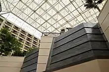 With the design and opening of the Hyatt Regency Atlanta in 1967, the Hyatt Regency brand trademark became its open atriums containing trees, waterfalls, and glass elevators, aiming to be tourist attractions of their own.[4] The Bayshore Highway Hyatt became the Hyatt Regency Burlingame and underwent reconstruction in the 1980s, with $90 million spent to re-open in 1988 with around 800 rooms over 10 floors.[5] In 1989, the hotel's distinct appearance was described in Building Design and Construction, explaining that it has "an 182-ft. by 182-ft. space frame that is covered by a Teflon-coated fiberglass fabric" and a "glass daylight system ... attached to its perimeter."[6][7]