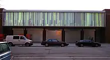 The Hyde Park Art Center's current building was designed by internationally recognized Chicago architect Douglas Garofalo of Garofalo Architects. The new building was converted from an old Army warehouse leased indefinitely to HPAC by the University of Chicago for $1 a year. The total budget for the project was $3 million.[3] Garofalo "was selected to design a building that would highlight accessibility between artists and the public, transparency of the process of art making and exhibiting, and encourage experimentation with technology and concepts."[4] Two of the building's most notable architectural features function to both problematize and undermine the institutionalized boundaries, both tangible and intangible, that often exists between art organizations and the public: the first floor of the building includes "five metal garage-style doors that open up to the main gallery from the sidewalk,"[4] thus extending the gallery space into the street and allowing the public to enter the Art Center easily and at will; and the second floor features "a 10x80 foot glass facade ... outfitted with a system of high range projectors, computers, scrims and screens used primarily to show large-scale digital artworks,"[4] that can be viewed from both inside and outside the Art Center.