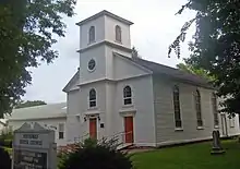 The main church building is a two-story, three-bay frame building on a slightly exposed stone basement. It is sided in clapboard with an asphalt-shingled gabled roof topped by a four-story blunt steeple on the western (front) elevation. The northeast corner is pierced by a brick chimney.[2]