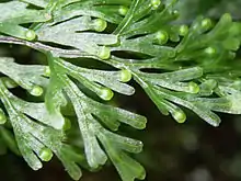 Hymenophyllum flabellatum showing sori at tips of lateral segments.