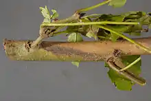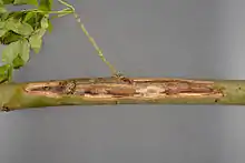 Initially, small necrotic spots (without exudate) appear on stems and branches. These necrotic lesions then enlarge in stretched, perennial cankers on the branches, wilting, premature shedding of leaves and particularly in the death of the top of the crown.[29] Below the bark, necrotic lesions frequently extend to the xylem, especially in the axial and paratracheal ray tissue.[30] The mycelium can pass through the simple pits, perforating the middle lamella but damage to either the plasmalemma or cell walls was not observed.[31] The disease is often chronic but can be lethal.[18] It is particularly destructive of young ash plants, killing them within one growing season of symptoms becoming visible.[32] Older trees can survive initial attacks, but tend to succumb eventually after several seasons of infection.[32]