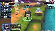 The game features chibi versions of the original Hyperdimension Neptunia characters which battle against enemies on a tactical grid map.[6][7] The gameplay is turn-based, and map elevation has an effect on characters' abilities and mobility; certain units are more capable of climbing to higher terrain than others, and units take damage from falling.[8] The field maps feature various gimmicks, including rail cars, flaming pits, logs, artillery batteries, laser beams and moving platforms.[9] Each of the playable characters move by traveling along each square of the map grid, however certain enemies are able to take up more than one square on the map grid.[10][11]