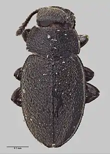 The adult beetle is 1.1 - 1.2 mm long and has a black body with pale coloured setae that give the insect a grey appearance. The larvae of this beetle are 2 mm long and are coloured pale to dark brown. Both the adult beetle and its larva are very similar in appearance to the species Hyphalus insularis.[1]