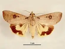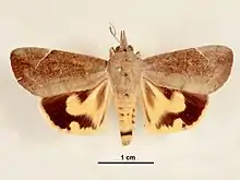 The wingspan is about 30 mm. Adults have brown forewings with a curved pale band along the inner margin. The hindwings are yellow with brown markings. There is a broad brown band running along the margin. They pierce fruit to suck the juice.[1]