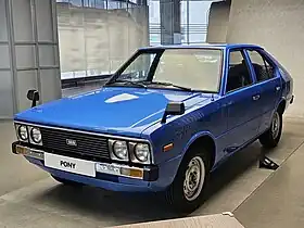 The Hyundai Pony (Hangul: 현대 포니), is a small automobile produced by the South Korean manufacturer Hyundai from 1975 until 1990. The Pony was South Korea's first mass-produced[1] and exported car. It has a front-engine, rear-wheel-drive layout and variants were made with two-door coupé utility, three-door liftback, four-door saloon car, and five-door liftback or estate car body styles. The Pony nameplate remained in use until 2000 on some export versions of the Hyundai Excel and Accent.