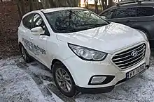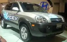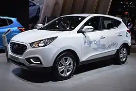 The Hyundai ix35 FCEV or Tucson FCEV[1] is a hydrogen fuel cell electric vehicle developed by Hyundai. The model is a left-hand drive only conversion to the SUV platform it is based on and was the first of its type to be mass-produced and sold commercially in the world.[2][3] Different versions are known, the previous version was based on the Hyundai Tucson FCEV, and the upcoming model is based on the current ix35 FCEV. The first generation was introduced in 2001, with the Hyundai Santa Fe FCEV, and had a range of 100 miles (160 km), with a top speed of 78 mph (126 km/h).