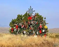 The 20-foot-tall (6.1 m) one-seed juniper (Juniperus monosperma)[3] tree was decorated annually for over 30 years[4] and is famous around the state.[5] Unlike a traditional Christmas tree, it is actually shaped like a bush, being nearly as wide as it is tall.[6] Decorations include Christmas ornaments, tinsel and garland,[4] stuffed animals, bows, flags, and it is topped with a silver star.[2] The tree is at a point where the terrain necessitated a wide separation between the northbound and southbound lanes of I-17, and the median is over 100 feet (30 m) wide. The median is under the jurisdiction of the Arizona Department of Transportation (ADOT), who have said "that for years, no one has been able to figure out who is responsible".[5] The tree is surrounded by four water storage barrels and plastic drip tubing to supplement the sparse natural rainfall in the area.[7] The irrigation system is also believed to have been installed by the unknown tree decorators.[5] In 2013, ADOT spokesman Doug Nintzel said people have told him that they know who is responsible but have not said who it is.[7]