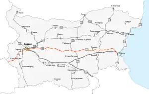 National Road I-6 (Bulgarian: Републикански път I-6) is a major road in Southern Bulgaria. It runs from Gyueshevo at the border with North Macedonia and Burgas on the Black Sea coast. With a total length of 508.5 km (316.0 mi), I-6 road is the longest road in Bulgaria.