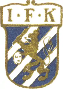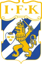 The crest of IFK Göteborg has its origins in the coat of arms of the city of Gothenburg which in turn is based on several other heraldic arms. The lion on a field of silver and blue is the heraldic arms of the House of Folkung, and the lion holds the Three Crowns of Sweden, both symbols being used in the coat of arms of Sweden. This arms was granted to Gothenburg by Gustavus Adolphus.[38] The coat of arms of the city sees the lion facing the sinister (heraldic left, which is viewer's right) side which often is interpreted as a fleeing lion, the normal being a lion facing the dexter (heraldic right) side, and IFK chose to use the latter on the club crest. Finally the three letters IFK were added on top. This crest has been used since it first appeared on the kit in 1919.[39] These main elements have not been modified since then, but during the years several different designs of the crest have been used, occasionally having the lion facing the sinister side. In the early 1980s, the club standardised the design and only minor changes, such as element colours and different hues, have been made since then, with the exception of the years 1997–1999 when IFK, with Reebok as kit sponsors, used a crest with some more distinct changes to the standard elements.[40] Details of the crest were slightly updated in 2020 to increase visibility and clarity, and the blue colour was modified. The new blue colour is the result of analysing different blue hues used in home kits from the last 40 years, and selecting the mean colour value.[41] Before 1919 various other symbols were used, with the four-pointed star of the IFK associations featuring on the shirts until 1910.[40]