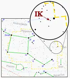 IK Pegasi (or HR 8210) is a binary star system in the constellation Pegasus. It is just luminous enough to be seen with the unaided eye, at a distance of about 154 light years from the Solar System.