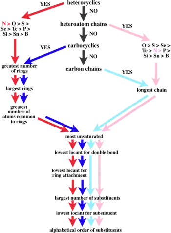 Figure 1. The order of subunit precedence. The subunit with the highest precedence is at the top centre. Subunits of lower precedence are found by following the arrows. The type of subunit, be it a heterocycle, a heteroatom chain, a carbocycle, or a carbon chain, determines the colour arrow to follow.[9]