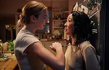 Burt identifies moments of stereotypical female roles that are twisted in the episode. After commenting on the use of the kitchen scene to pace the episode and draw on realism, say that it is a good example of "including notes of mundane absurdity during objectively terrifying moments", she suggests that being a "thoroughly domestic scene", where the characters "eat shepherd's pie heated up in the microwave" has made Eve apologise for not expecting Villanelle, showing that "how she's been socialized to behave as a woman bubbles up" in the location, taking precedence over spy training and survival instincts.[6] She also notes that Carolyn uses maternal comfort to get the truth from Frank where interrogation did not work, and revealing her to be the caring mother of Kenny, though she normally shows no sign of having maternal instincts.[6] Lisa Weidenfeld of The A.V. Club equally notes that though Carolyn's unexpected mothering position is feminine, it "subverts the notion that a female spy in that moment in a far more traditional story would be using her feminine wiles on a man", with the show routinely breaking down the idea that women should use sex appeal.[7]