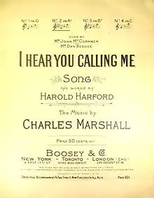 "I Hear You Calling Me" is a British popular song published in London in 1908 by Boosey & Co. The lyrics were by Harold Lake (a journalist writing as Harold Harford) and the music by Charles Marshall (1857-1957). The song became a signature song for the tenor John McCormack.