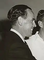 As captain, Johnson was noted for his public relations skills and his gift for public speaking.[103] He was optimistic by nature, with a belief in "guts and determination".[104] However, he was seen as insensitive at times; Bill Johnston took offence when Johnson attempted to rouse him during a practise session: "Just cos you are one of the old blokes in the side doesn't mean you don't have to bloody well put in you know."[69] At times his optimism could appear artless and naive. Ian Craig—his successor as Australian captain—was critical of Johnson's attitude during the 1956 tour of England: "I don't think [Johnson] was ever realistic about the situation. [...] I supposed he felt obliged to make rallying speeches, but the team knew what was going on."[86] Pat Crawford felt "Johnson couldn't get anything out of the players, whereas the guys would have busted a gut for [Miller]".[86] He was seen by some of his teammates as "dictatorial" with Benaud and Harvey particularly resenting Johnson's insistence on the entire touring party attending every lead-in match before 1956 Test series in England.[21][86]