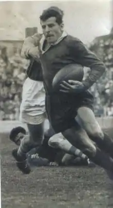 He debuted for Australia in the inaugural World Cup in France in 1954. He is listed on the Australian Players Register as Kangaroo No. 313.[3] Moir also played Tests against all the rugby league playing nations and toured Great Britain with the 1956 Kangaroos where he played in two Tests and 14 tour matches and topped the tour try scoring list with 13 tries. He also featured in Australia's victorious 1957 World Cup campaign played at home. Said to have been the fastest winger in the Sydney competition,[4] he is one of six Rabbitohs players to score five tries in a match, doing so in Round 7 of 1957 against Parramatta at Redfern Oval. His 105 career tries for the Rabbitohs in 110 games stands in fourth place behind Alex Johnston's 147 in the all-time club record list.